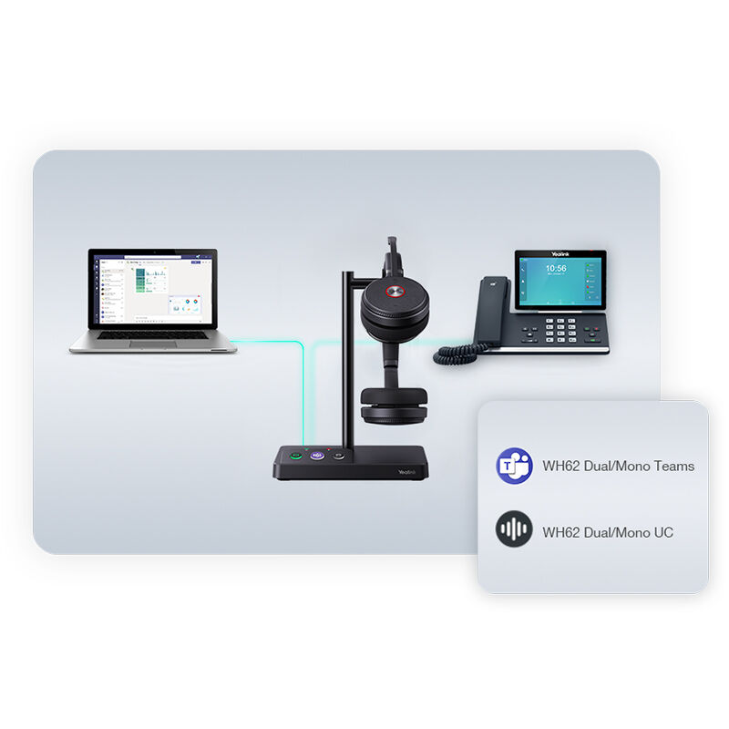 Yealink (WH62) Wireless Dect Headphones - Mono - UC Certified - with Base - 2.5mm - Ringer - Busy Light